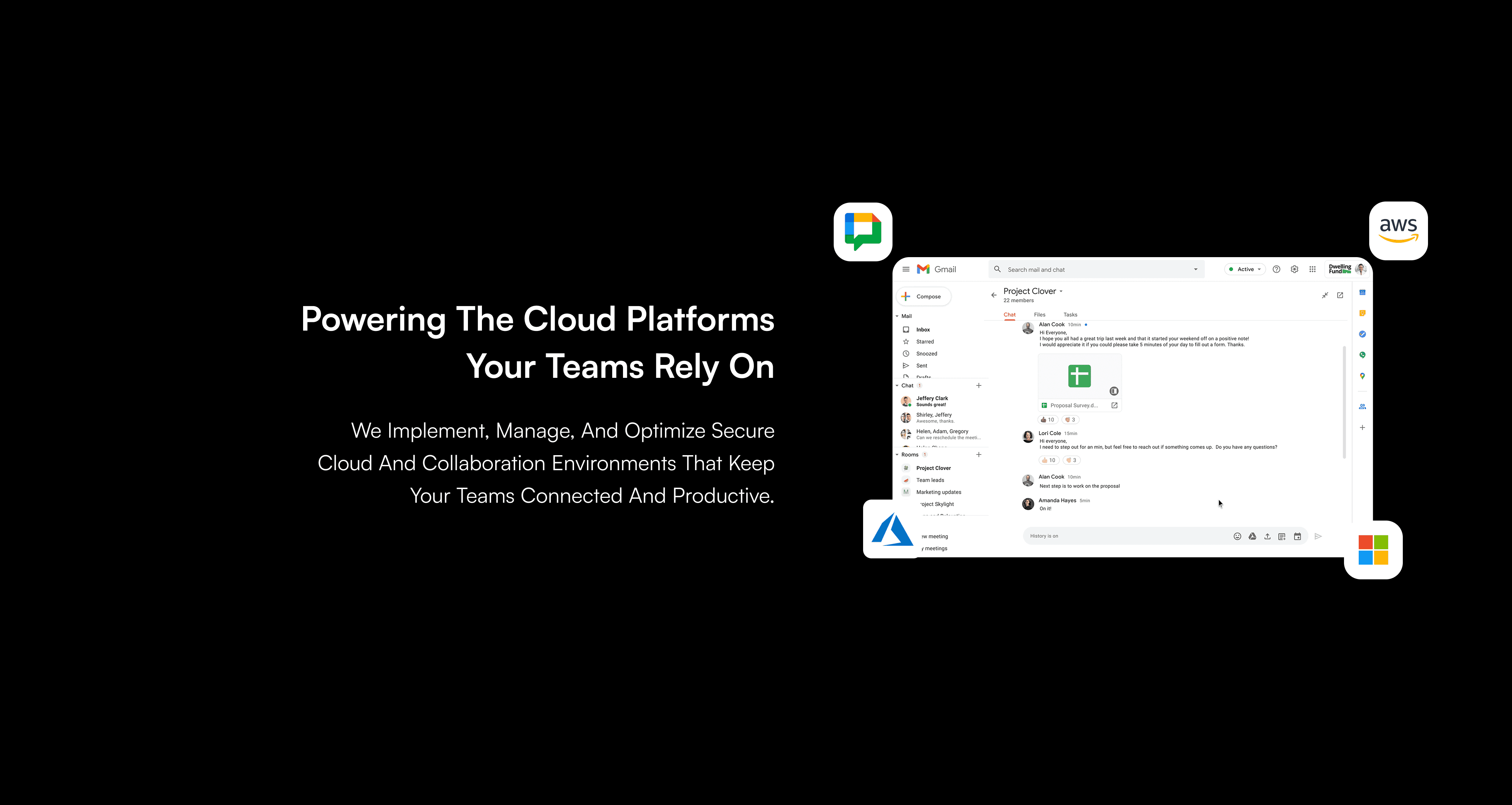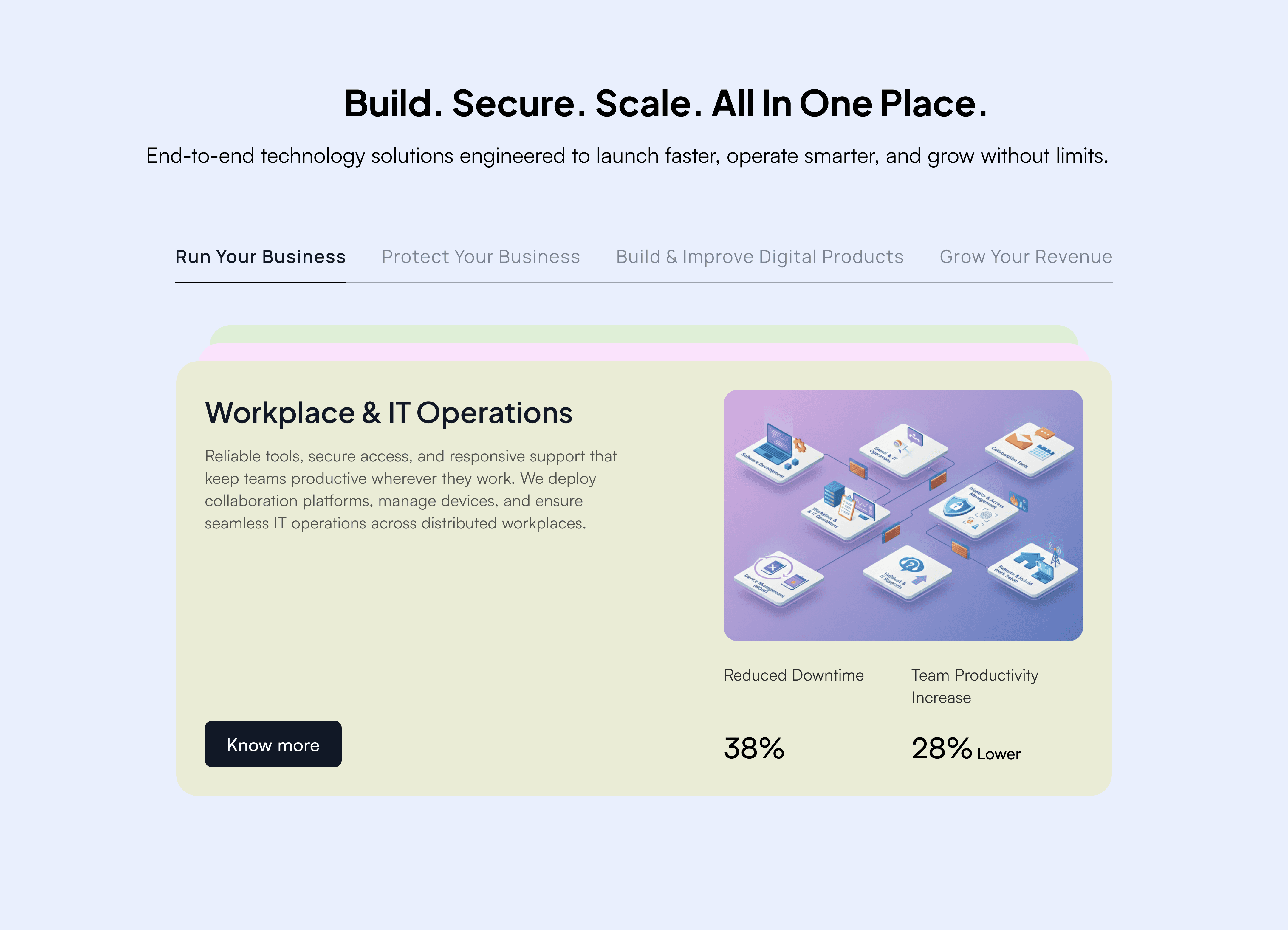 Single Tech Partner Positioning: Unified presentation of cloud, security, development, hardware, and B2B marketing services.