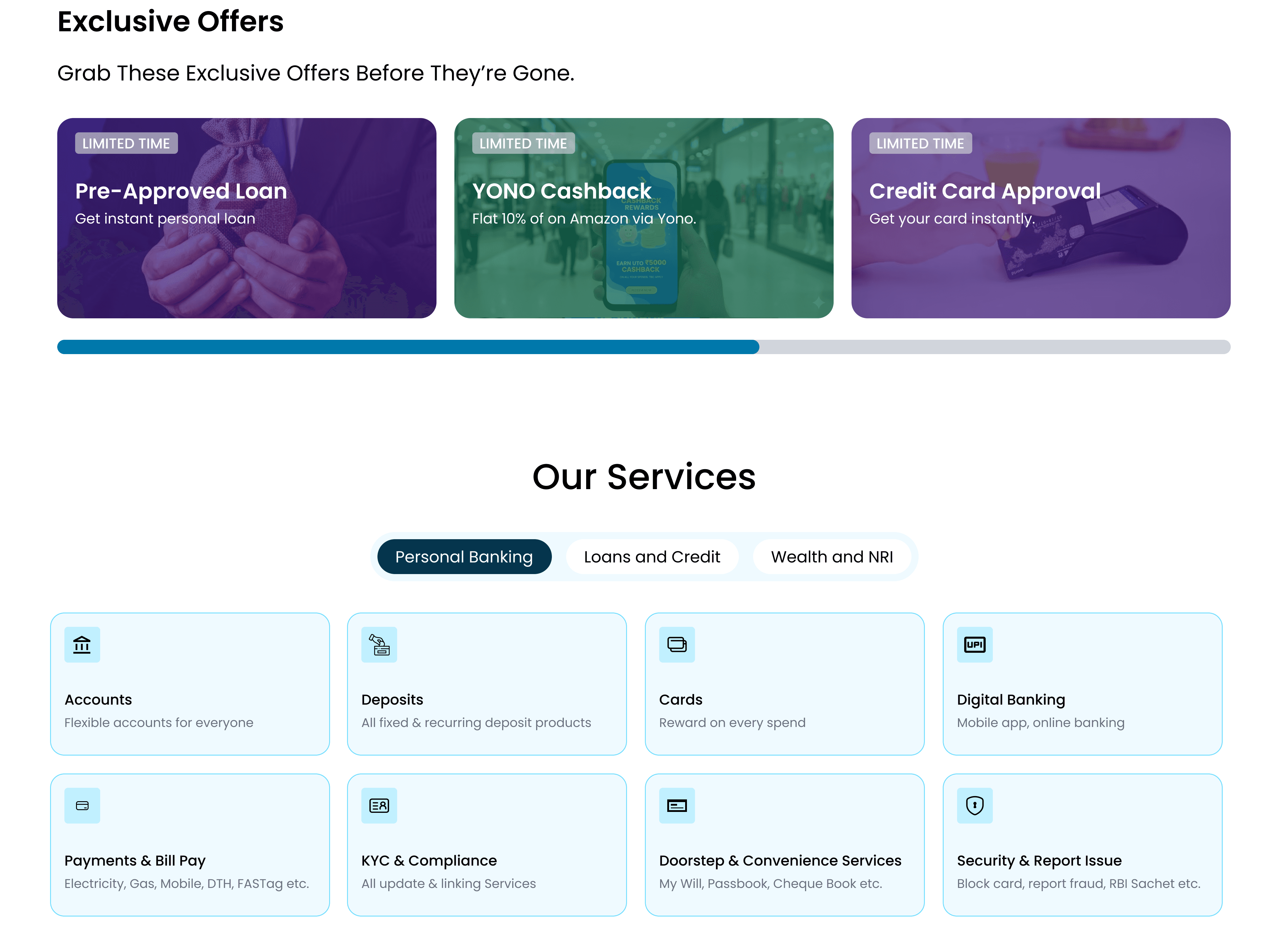 The website was redesigned with a clear two-level navigation system that groups services into intuitive categories such as Personal, NRI, Business, Agriculture & Rural, and International Banking. Non-essential content was removed from the homepage and shifted to inner pages to reduce clutter. A clean, card-based layout and simplified menus were introduced to highlight only the most important actions, enabling users to find services faster, understand options easily, and complete tasks with minimal effort.